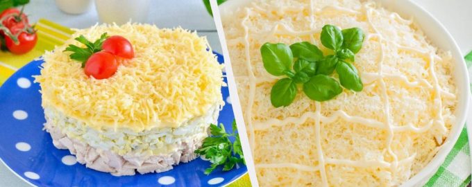 Grattugiate le proteine e il formaggio con una grattugia a grana grossa. Ora disponete l’insalata a strati con funghi fritti e pollo, spalmando ogni strato con la maionese. Prima viene metà del tuorlo e della massa di carne. Poi metà dei funghi, proteine. Quindi ripetere nuovamente gli strati con carne e funghi. Cospargere generosamente il piatto con il formaggio.