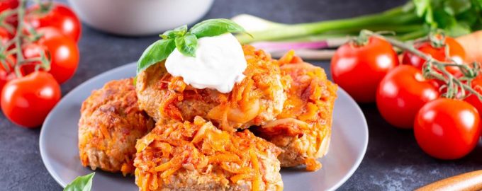 Mescolare il tutto in modo che il composto si attacchi bene. Se si sfalda, sbattere un altro uovo. Con le mani bagnate, formare i cavoli ripieni, passarli nella farina e friggerli nell’olio fino a farli dorare da entrambi i lati. Metterli in una casseruola dal fondo spesso. Mescolare il concentrato di pomodoro con la panna acida e aggiungere acqcalda fino a ottenere una salsa simile al kefir liquido. Condirla con le spezie e versarla sui cavoli ripieni. Se la salsa non li copre al 90%, aggiungere altra acq